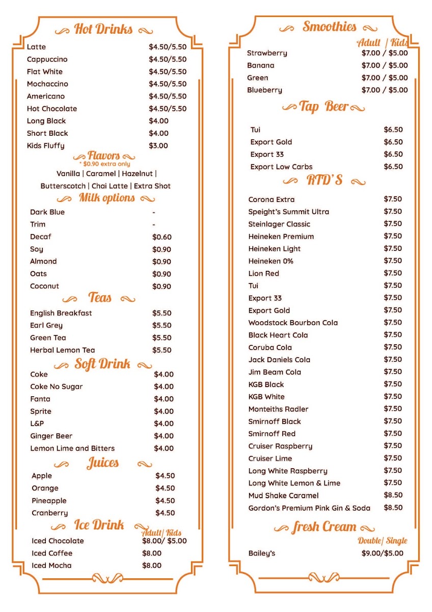 At WAYFINDERS Cafe & Restaurant, located in the heart of Waitara, New Zealand, the menu is a delightful journey through flavors, catering to all ages with a special focus on family-friendly dining. The KIDS MENU offers a range of delectable options, such as the playful Kids Pancake served with ice cream, and Kids Bacon and Egg with a comforting combination of scrambled eggs and toast, all priced at an approachable NZ$10.