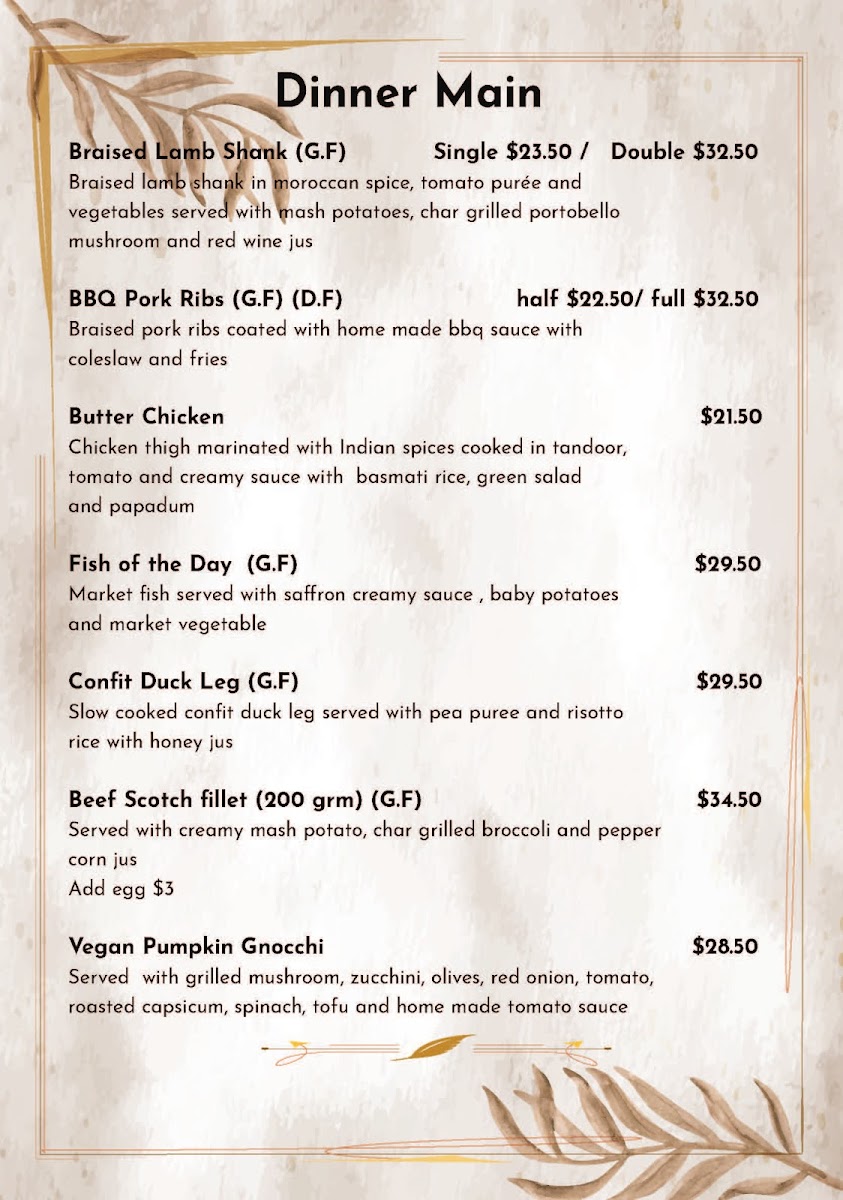 For the main course, experience the rich flavors of the Braised Lamb Shank, infused with Moroccan spices, or the succulent BBQ Pork Ribs, full of smoky goodness. Each dish stands out, providing an inviting atmosphere where every bite feels like a warm embrace.